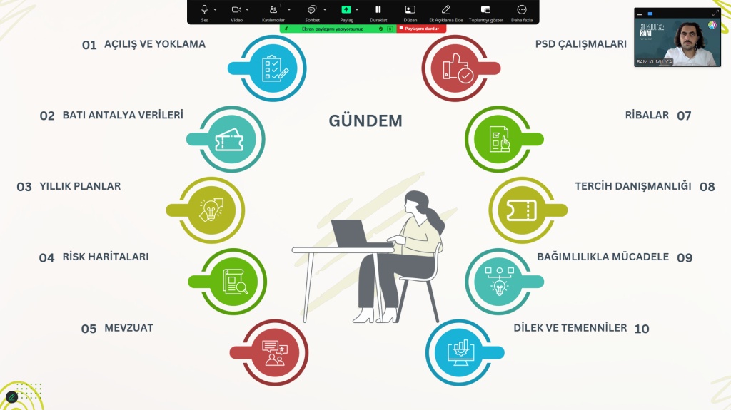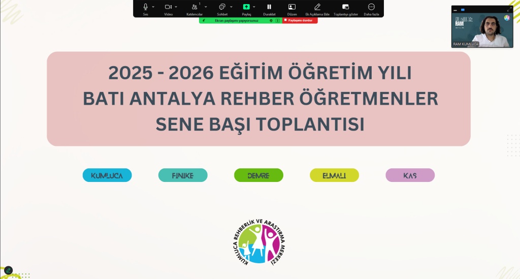 Kumluca rehberlik ve araştırma merkezi sorumluluk bölgesi olan Kumluca, Finike, Demre, Elmalı ve Kaş ilçelerinde gören yapan tüm resmi özel okullarındaki rehber öğretmenler ile 2025 - 2026 eğiti,m öğretim yılı sene başı toplantısı çevrimiçi olarak yapıldı.